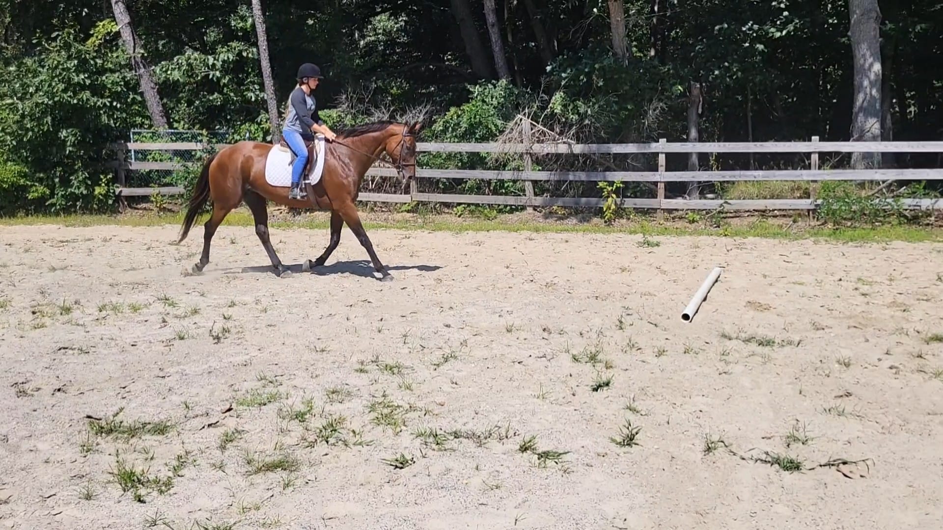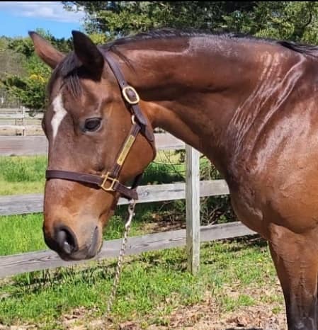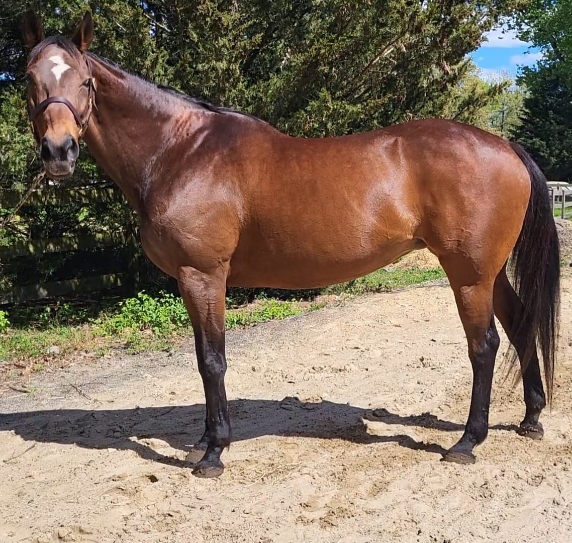Tuesday spent 10 years after her racing career with one family, living outside on their farm. Unfortunately, her family couldn’t keep her and she came back to us. She is a lovely lady standing about 16’2 with a sturdy build, but we’ve decided that she will best be served staying in one place and that place is with us. We’re happy to have her and believe she is, too!