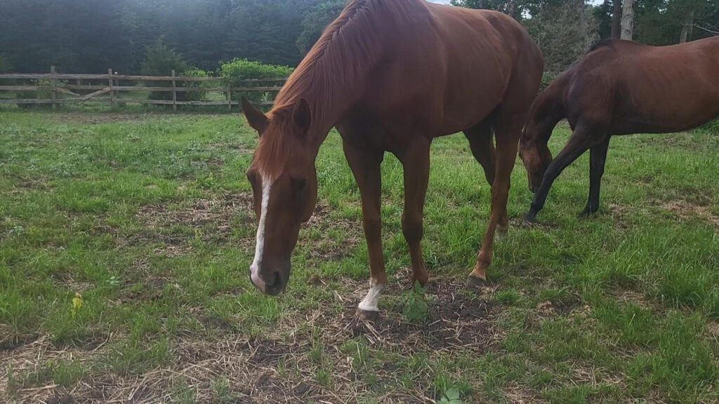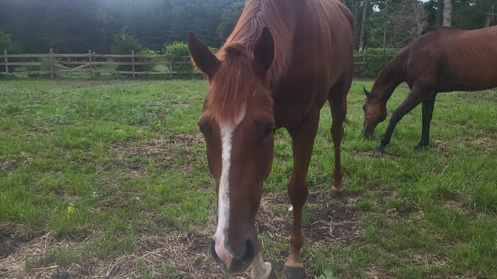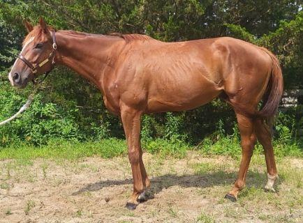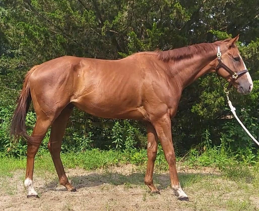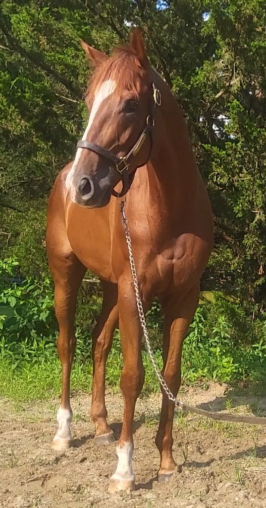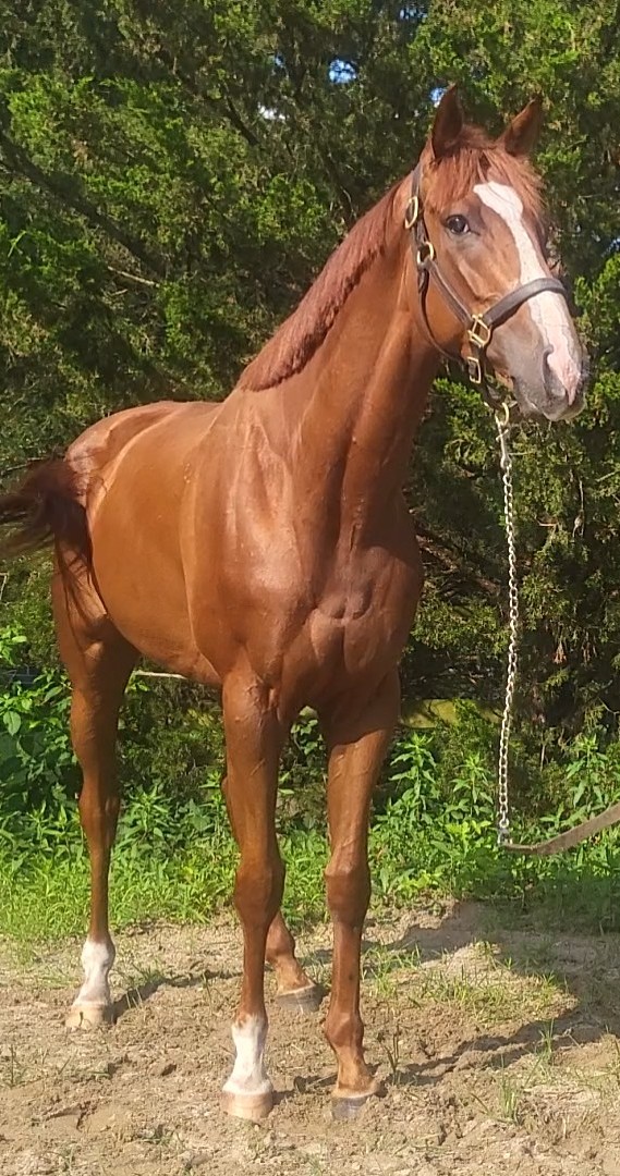 Ward Leader! This cute, kind guy has filled out and settled into farm life nicely. He came off the track sound with no real desire to be competitive, but could easily be geared up for a different discipline. He stands a leggy 16 hands, with a finer build and has been willing and easy to handle.